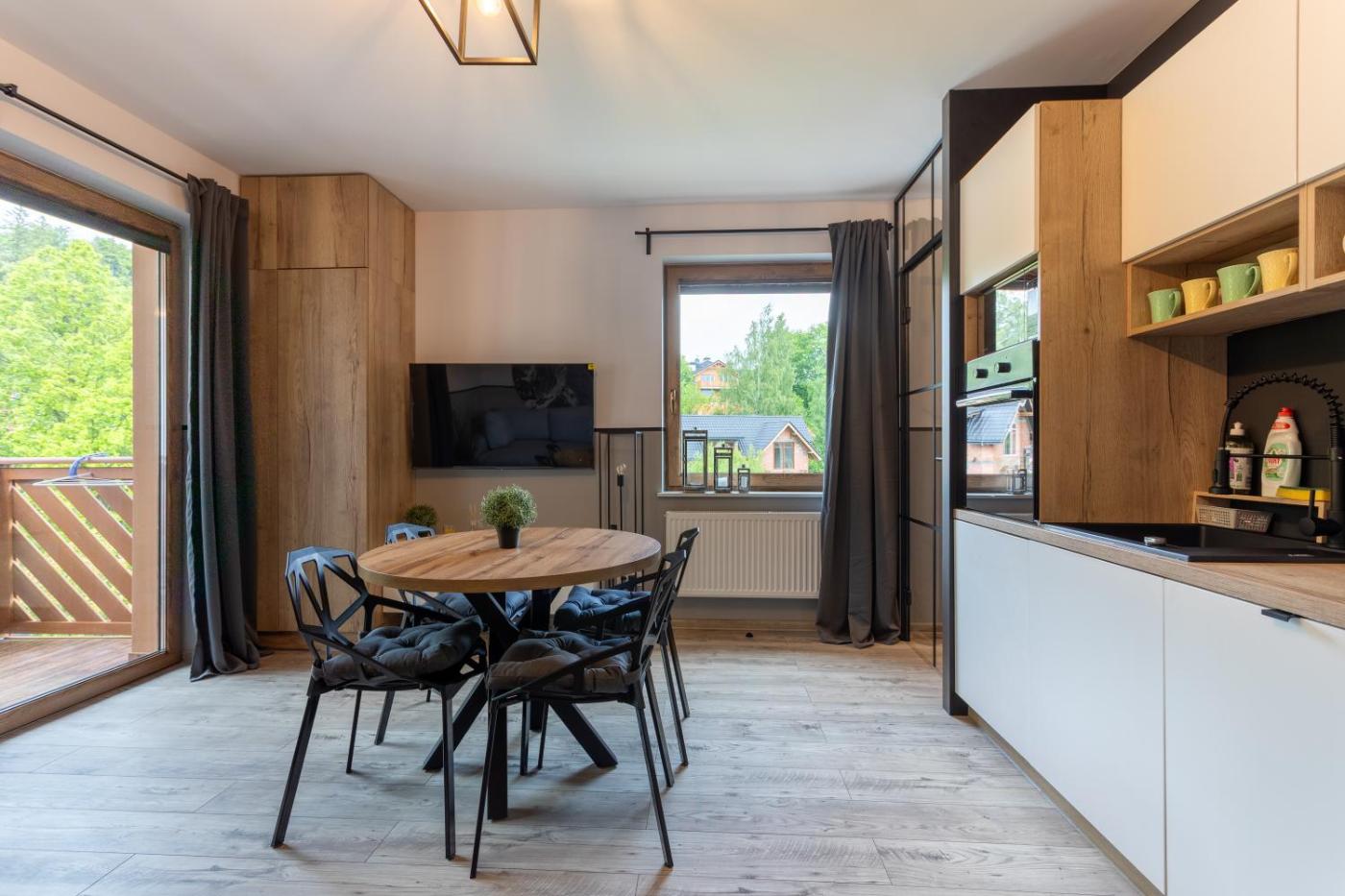 Apartament. This apartment comes with 1 living room, 1 separate bedroom and 1 bathroom with a shower and a hairdryer. Guests can make meals in the kitchen that features a stovetop, a refrigerator, a dishwasher and kitchenware. Boasting a terrace with garden views, this apartment also features a tea and coffee maker and a flat-screen TV with cable channels. The unit has 2 beds. Apartament - 4 osobowy. Powierzchnia pokoju ok.: 33 mkw.