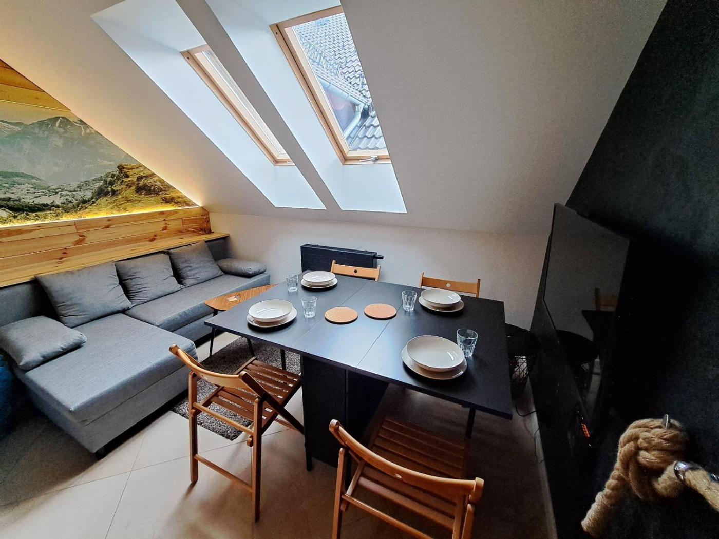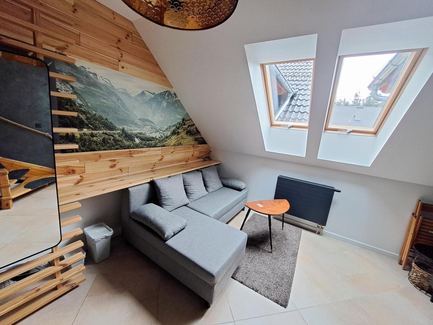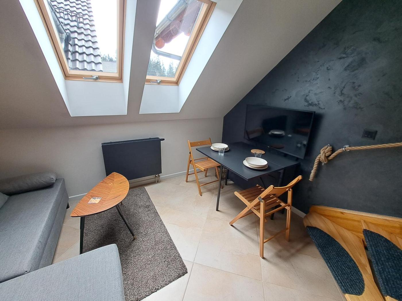 Apartament dwupoziomowy. This apartment consists of 2 living rooms, 2 separate bedrooms and 1 bathroom with a shower and a bidet. Guests can make meals in the kitchenette that is equipped with a stovetop, a refrigerator, a dishwasher and kitchenware. Featuring a balcony with garden views, this apartment also provides a tea and coffee maker and a flat-screen TV with streaming services. The unit offers 5 beds. Apartament - 6 osobowy. Powierzchnia pokoju ok.: 57 mkw.